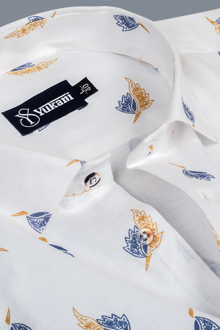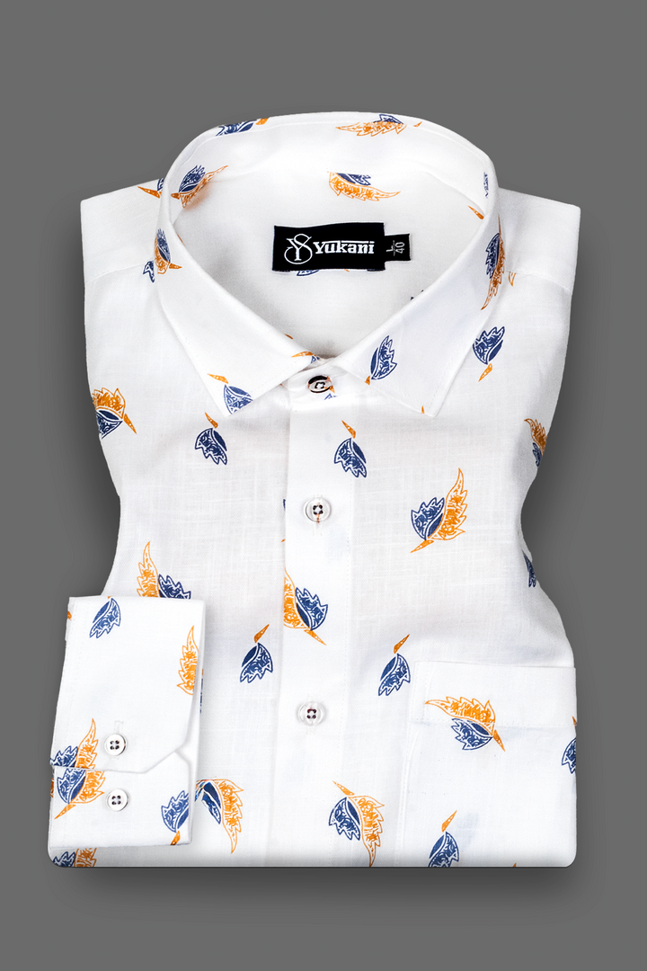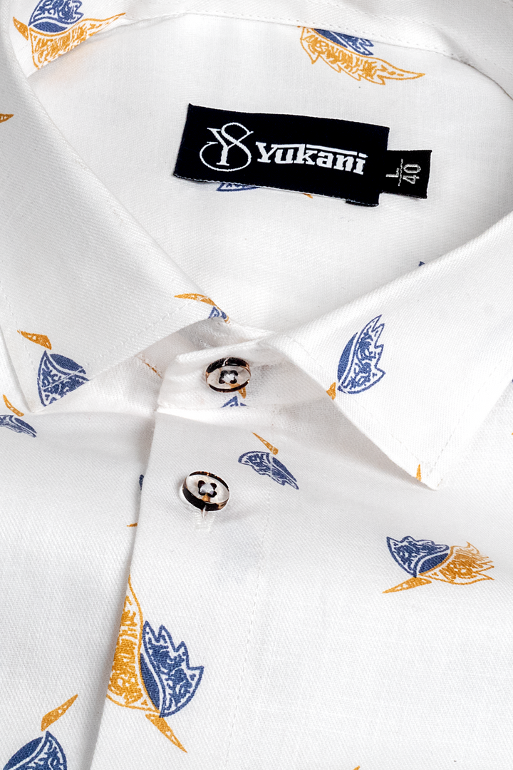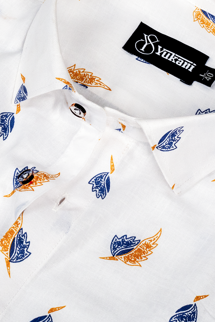 Turkey Linen White With Blue Orange Mix Print Shirts